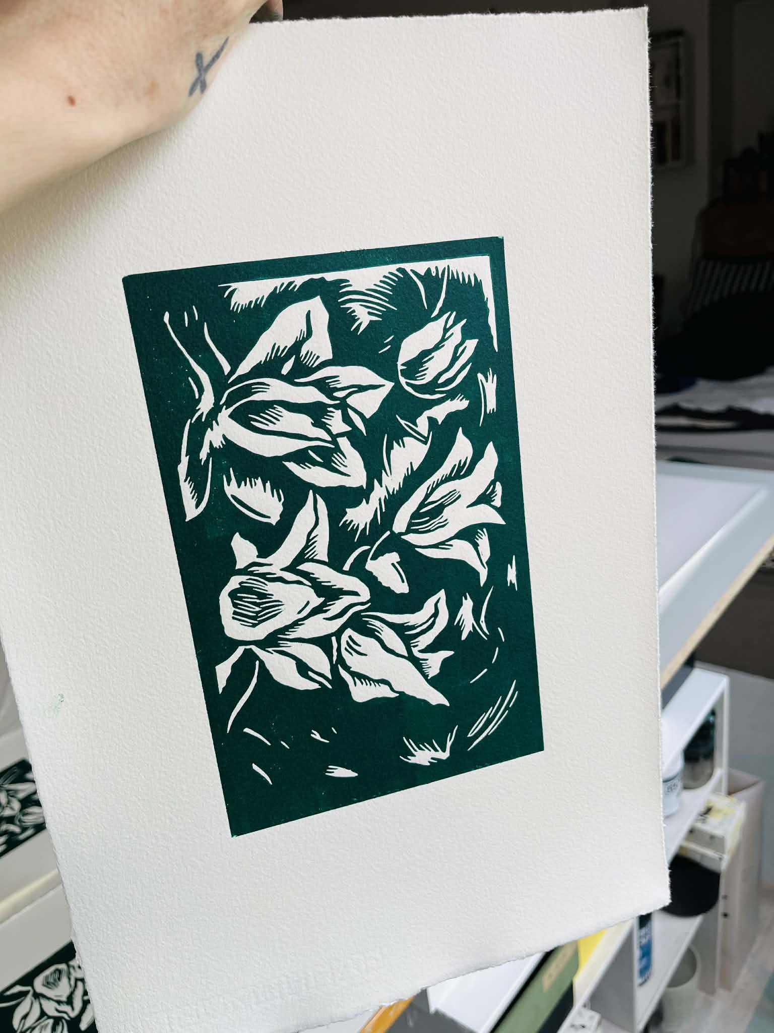 Dark green linocut print Handprintet on 230g Hahnemühle paper Limited edition of 22 signed and numbered papersize: 39x26 Printet in 2026